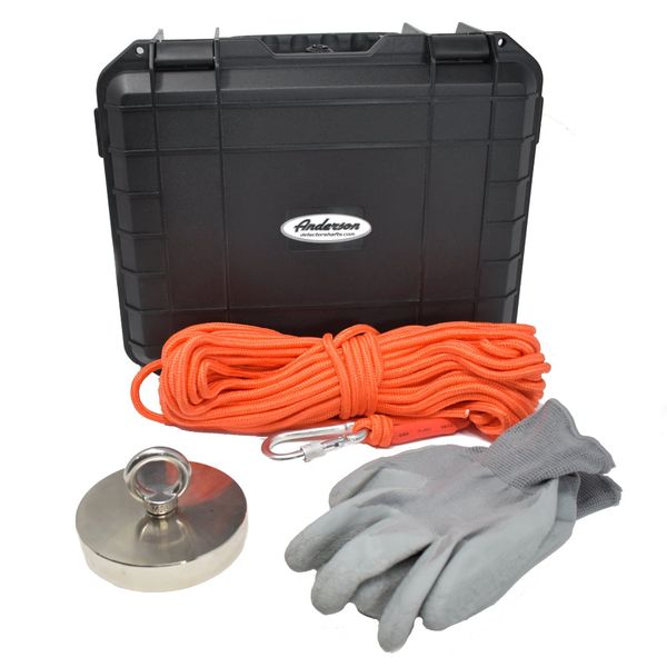 Everything you need to start Magnet Fishing! The kit includes a 1350lb pull magnet, 65ft of double braided rope with carabiner, and gloves... all packed in a heavy duty waterproof plastic case!